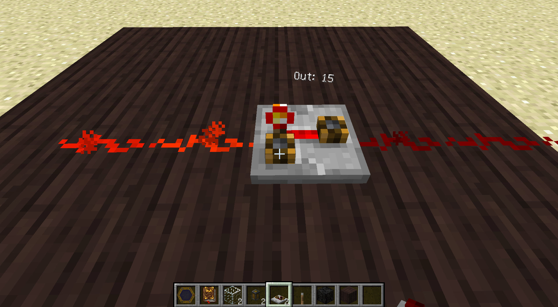 『In: 1』にしておけば信号が届いていれば反応するし、『In: 15』は電源との間にレッドストーンが1ブロックまでじゃないと反応しないことになる
