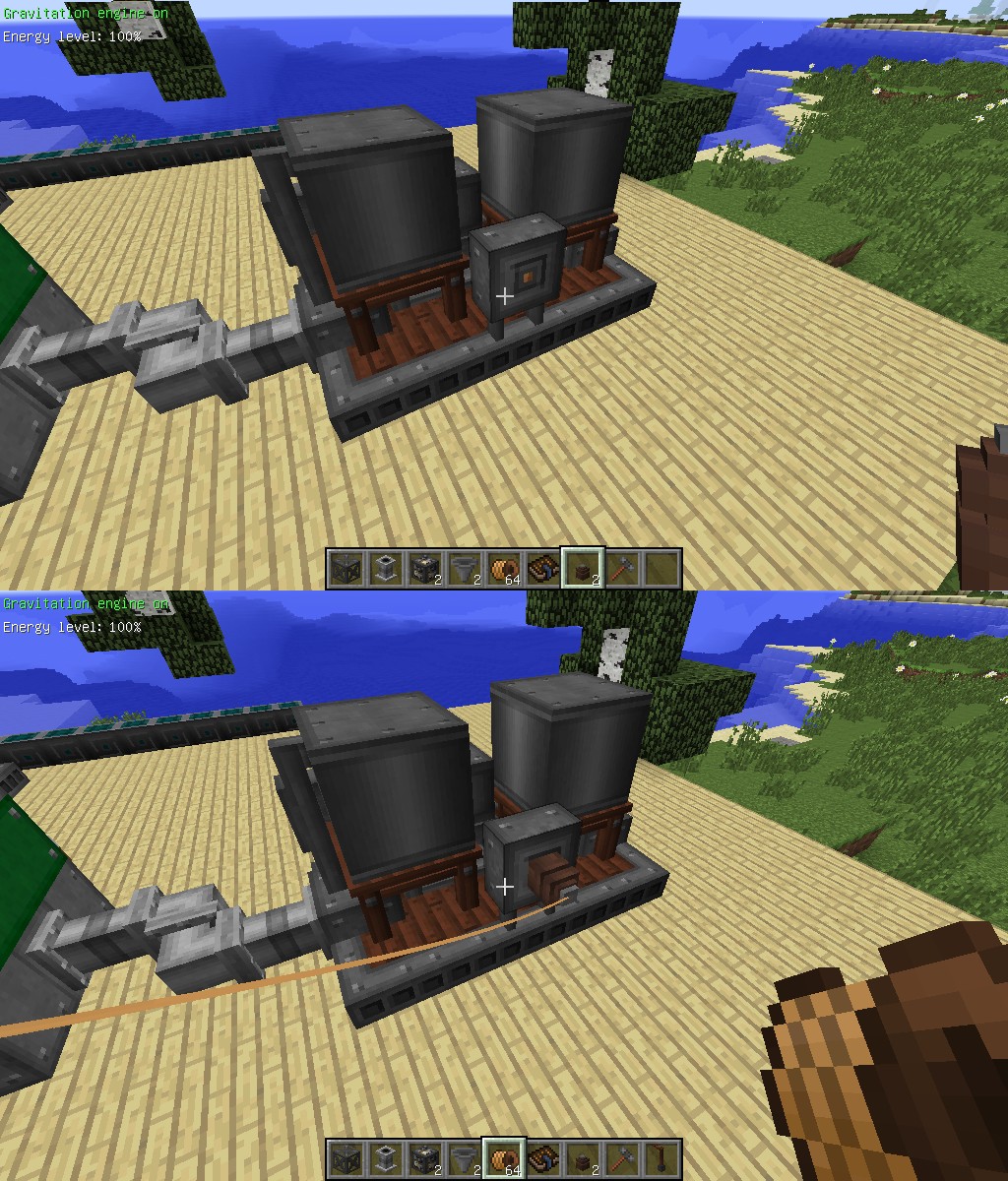 正面右に赤い点がある面があるのは、粉砕機と同じく、レッドストーン信号でON・OFF切り替えができ、信号を入れることで燃料の作成を止めることができる